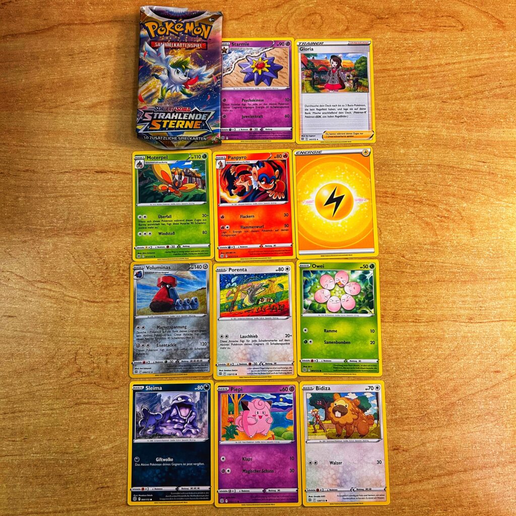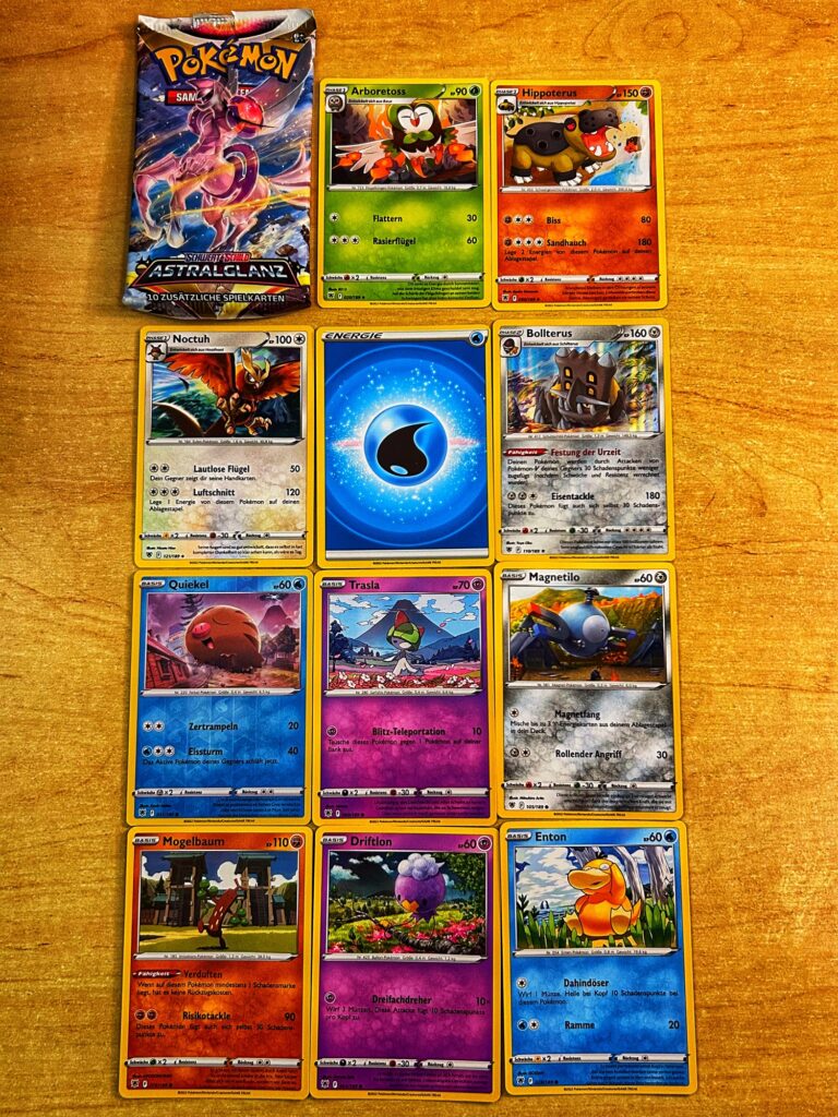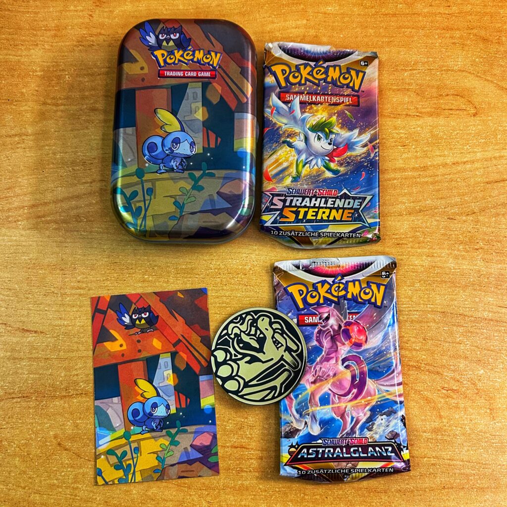 Am Ende waren zwei „Schwert&Schild“-Booster drin. Dazu eine Memmeon-Karte und eine schöne Glurak-Münze. Die Booster hatten nichts nennenswertes drin.